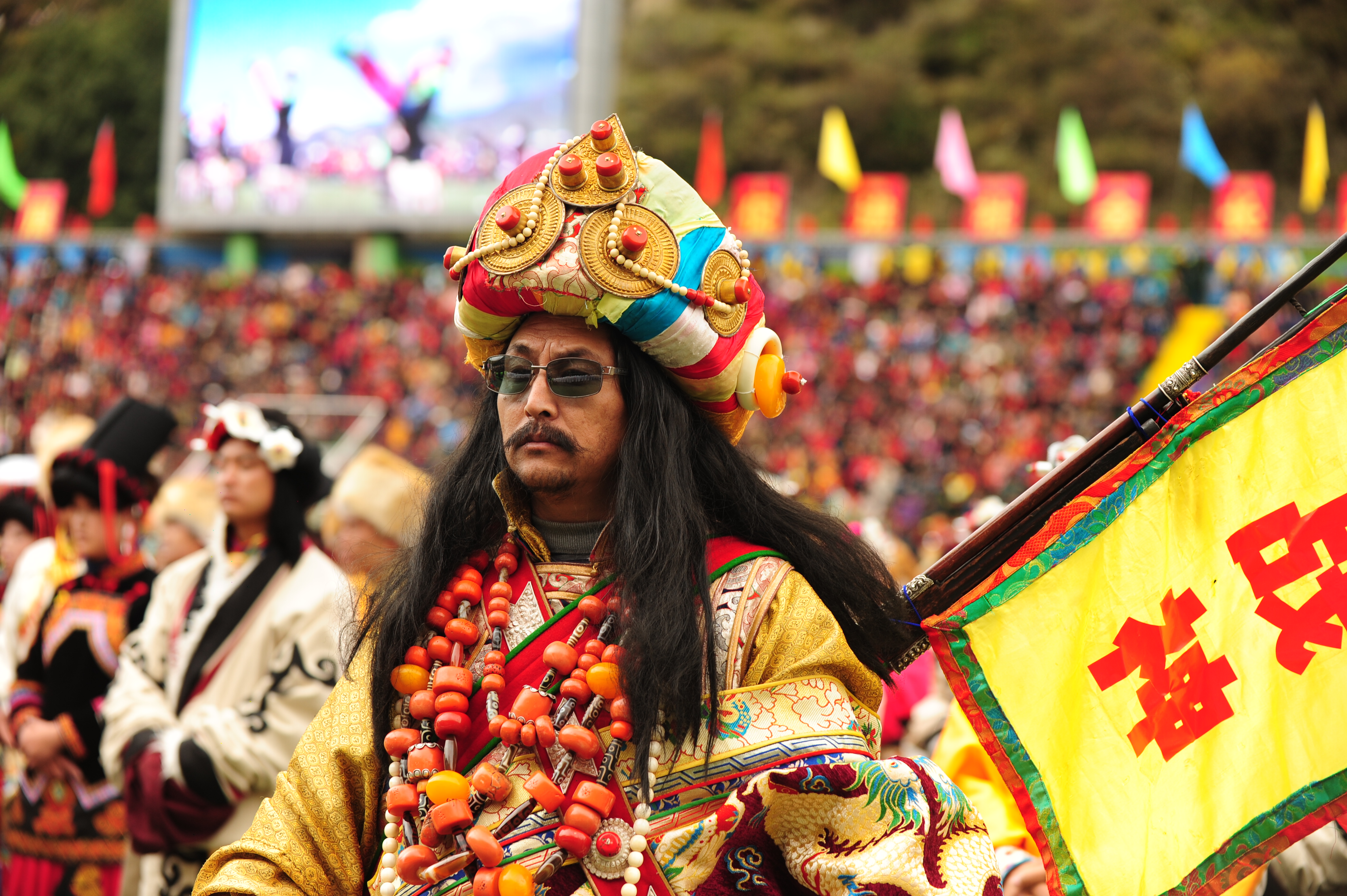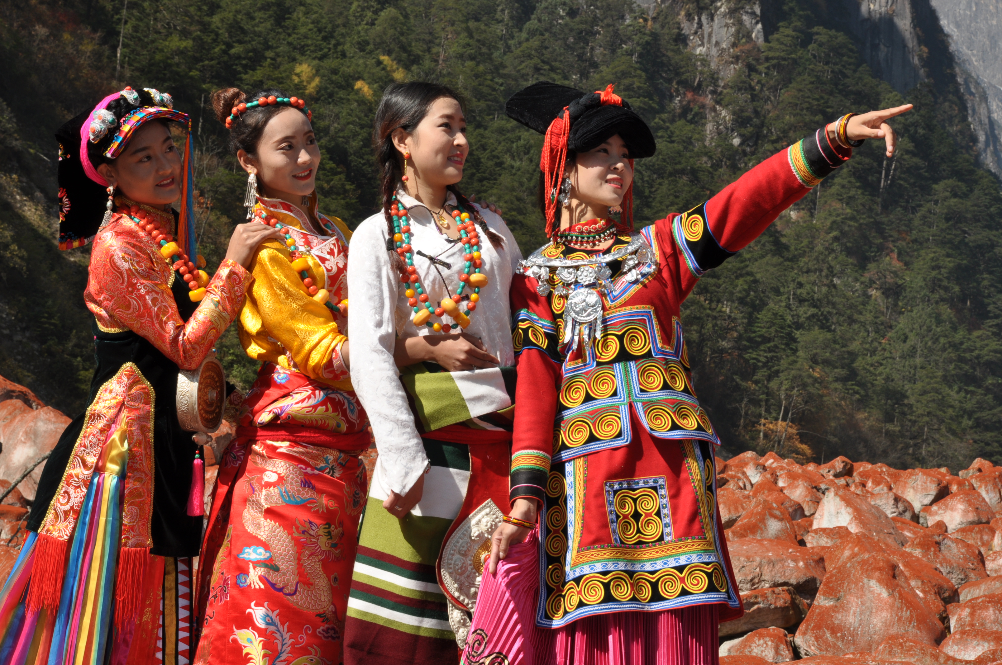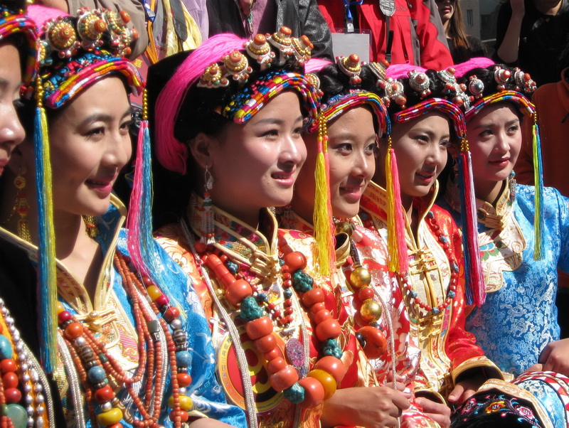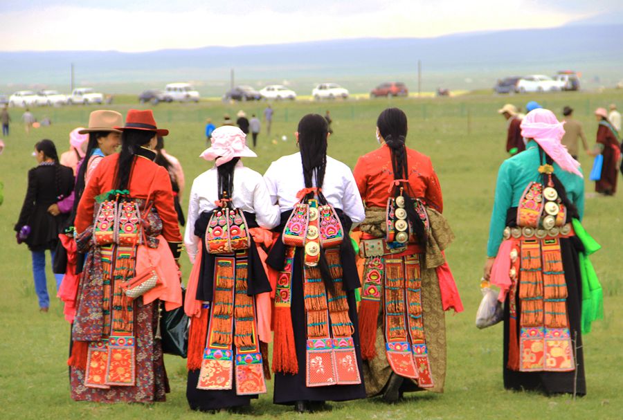由于藏族居住的环境及风俗习惯的差异、服饰上有一定的差别,但共同点是色彩鲜艳、华贵美丽、引人注目。