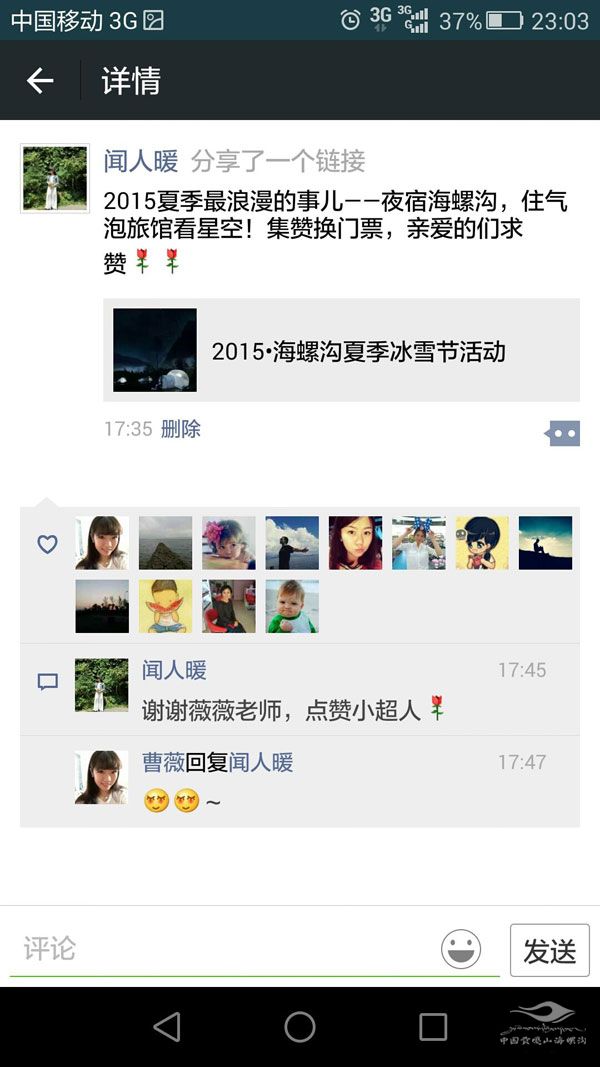 游客可将自己在海螺沟的旅游经历的真实记录,通过文字、图片、视频等方式,发布在个人微博、微信、旅游网站、天涯社区等社交网络及论坛上,并通过新浪微博和腾讯微博#海螺沟官方微博,分享给更多游客。