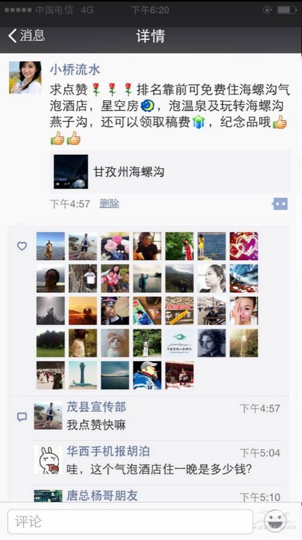 2.从现在开始,若您在微信朋友圈发表与“大美海螺沟”主题的相关文字,收到点“赞”后,将截图和联系信息打包发送到邮箱:282594606#qq.com。收获点“赞”最多的前10名游客将获得海螺沟地区贡卡布乡村特色酒店的星空房、玫瑰房、田园房等任选其一免费住宿一晚及海螺沟景区门票两张。